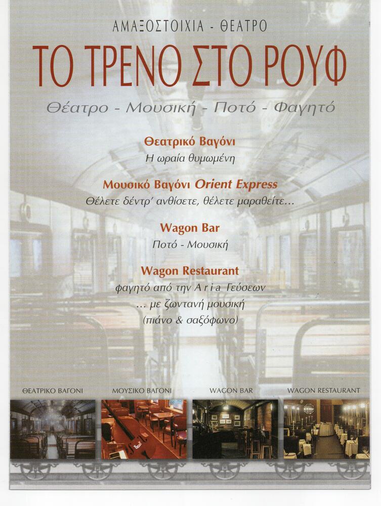 Το Τρένο στο Ρουφ, φυλλάδιο καλλιτεχνικής σεζόν 2002- 2003ΦυλλάδιαΠρόγραμμαΜουσικό Βαγόνι Orient ExpressΘεατρικό ΒαγόνιWagon-RestaurantWagon-Bar