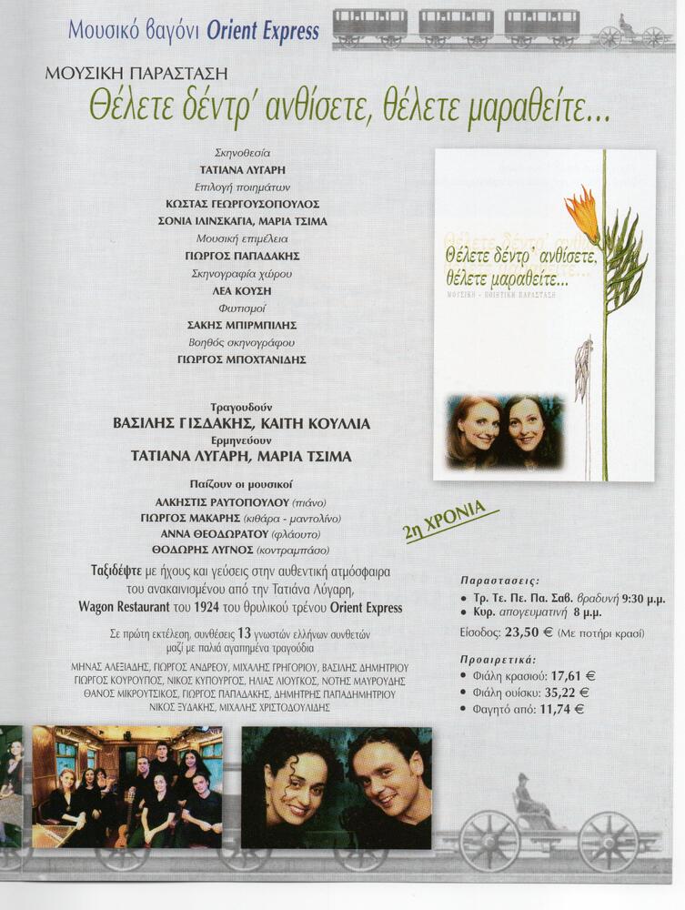 Θέλετε δέντρ’ ανθίσετε, θέλετε μαραθείτε, κριτική με σύντομες συνεντεύξεις, Κυριακάτικη ΕλευθεροτυπίαΚριτικέςΘέλετε δέντρ’ ανθίσετεΜουσικό Βαγόνι Orient ExpressΕλευθεροτυπίαΈφη ΜαρίνουΚριτικές
