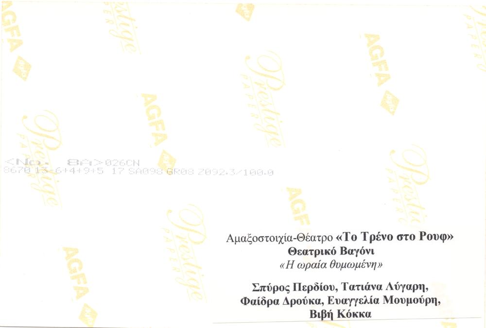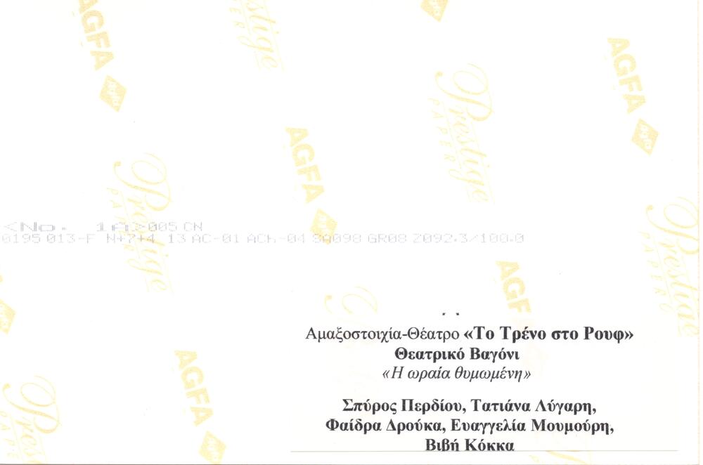 Φωτογραφικό υλικό του Χρήστου Λιάτση, της δεύτερης σεζόν από την παράσταση με τίτλο «Η ωραία θυμωμένη», που ανέβηκε στο Τρένο στο Ρουφ για δύο σεζόν (2002-2003 & 2003-2004).