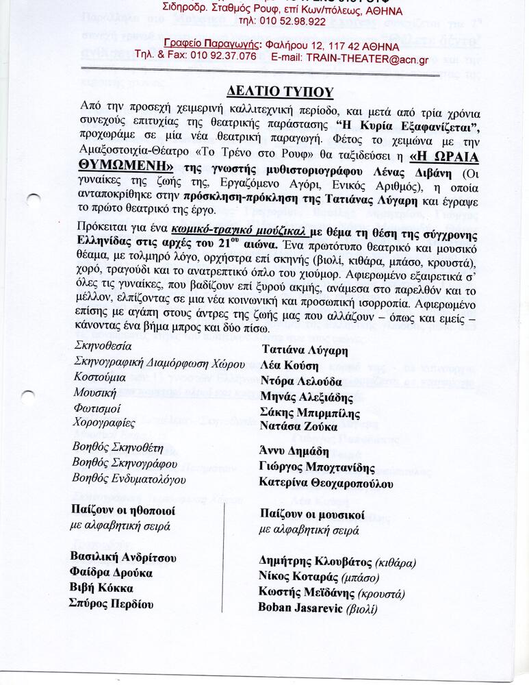 | Δελτίο Τύπου, «Η ωραία θυμωμένη», 1η σεζόνΔελτία ΤύπουΗ Ωραία ΘυμωμένηΠρώτη σεζόνΘεατρικό ΒαγόνιΗ Κυρία εξαφανίζεται3η σεζόνΘέλετε δέντρ’ ανθίσετε2ος ΧρόνοςΜουσικό Βαγόνι Orient Express |