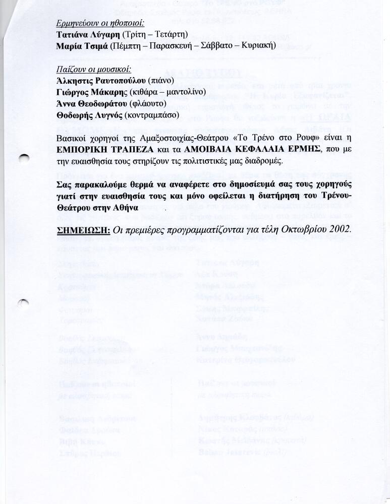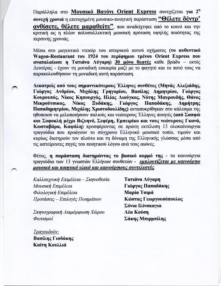 | Θέλετε δέντρ’ ανθίσετε, θέλετε μαραθείτε…, πρόγραμμα μουσικής παράστασης (2ος χρόνος)ΠρογράμματαΠρόγραμμαΜουσικό Βαγόνι Orient Express |