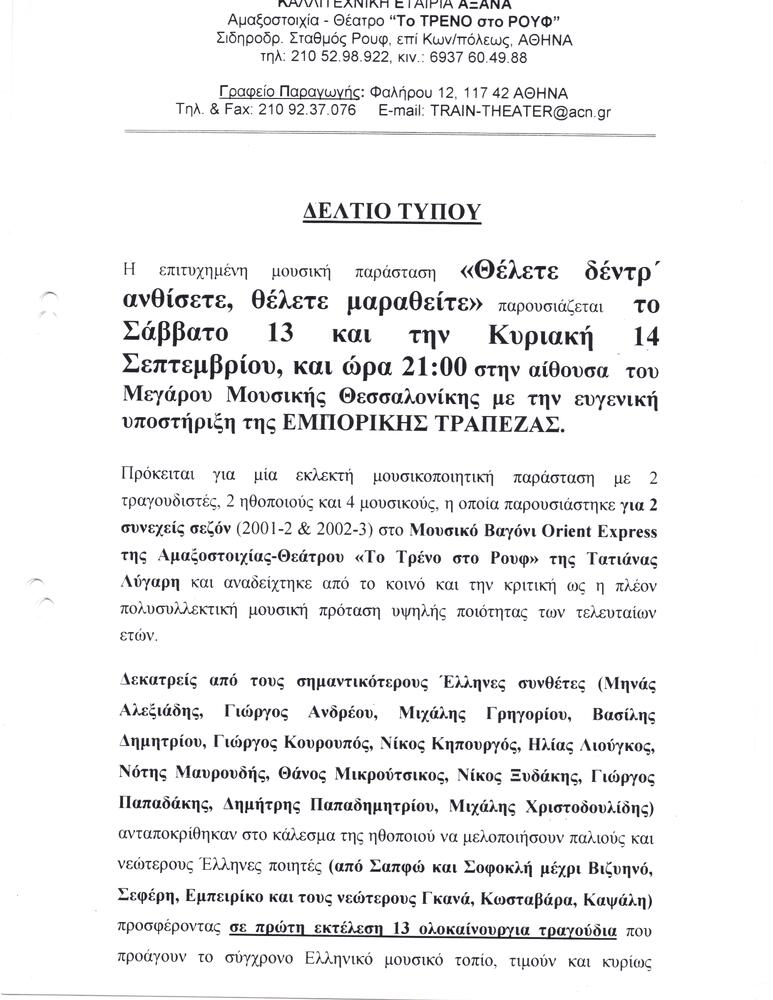 | Δελτίο Τύπου, Θέλετε δέντρ’ ανθίσετε, θέλετε μαραθείτε, Μέγαρο Μουσικής ΘεσσαλονίκηςΔελτία ΤύπουΘέλετε δέντρ’ ανθίσετεΠεριοδείαΤο Τρένο ταξιδεύειΜέγαρο Μουσικής ΘεσσαλονίκηςCDΕμπορική ΤράπεζαΔελτίο Τύπου |