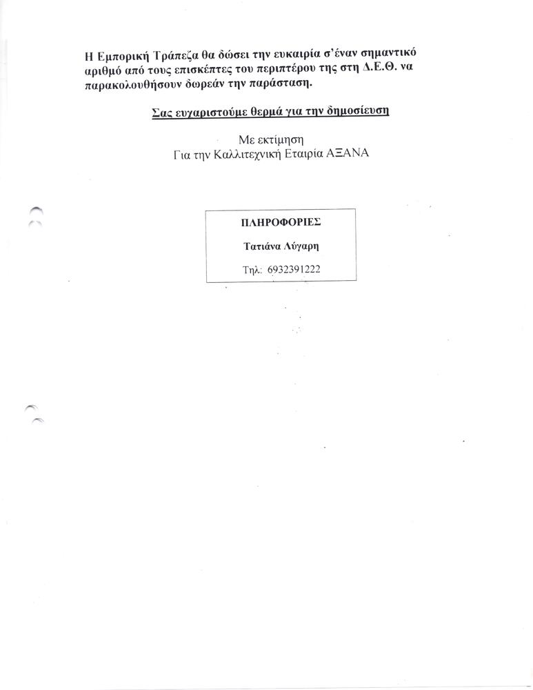| Θέλετε δέντρ’ ανθίσετε, θέλετε μαραθείτε, ΕλευθεροτυπίαΣτήλη ΘεαμάτωνΘέλετε δέντρ’ ανθίσετεΕλευθεροτυπίαΜέγαρο Μουσικής Αθηνών |