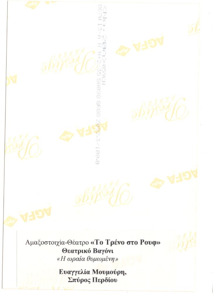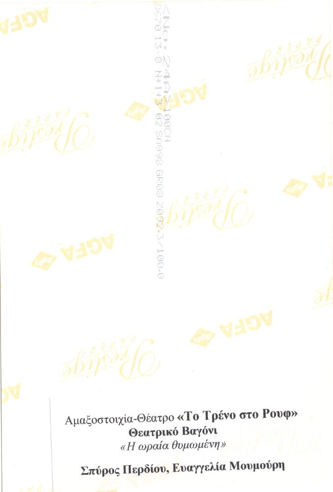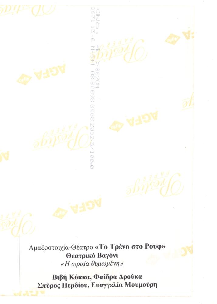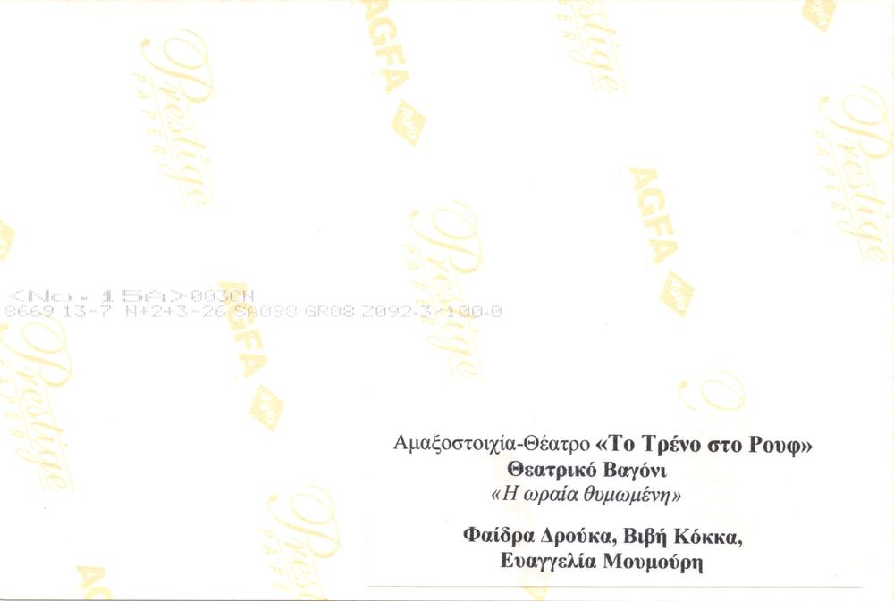 Φωτογραφικό υλικό του Χρήστου Λιάτση, της δεύτερης σεζόν από την παράσταση με τίτλο «Η ωραία θυμωμένη», που ανέβηκε στο Τρένο στο Ρουφ για δύο σεζόν (2002-2003 & 2003-2004).
