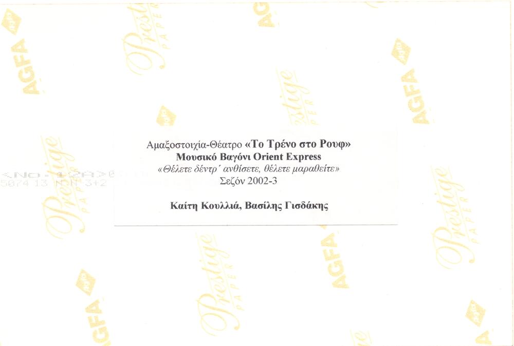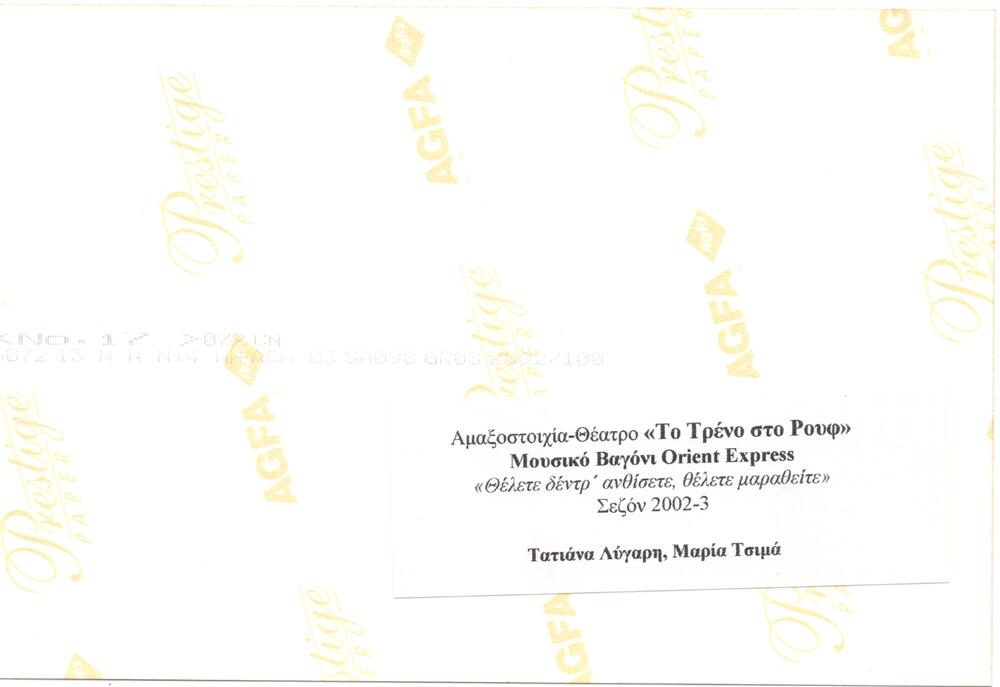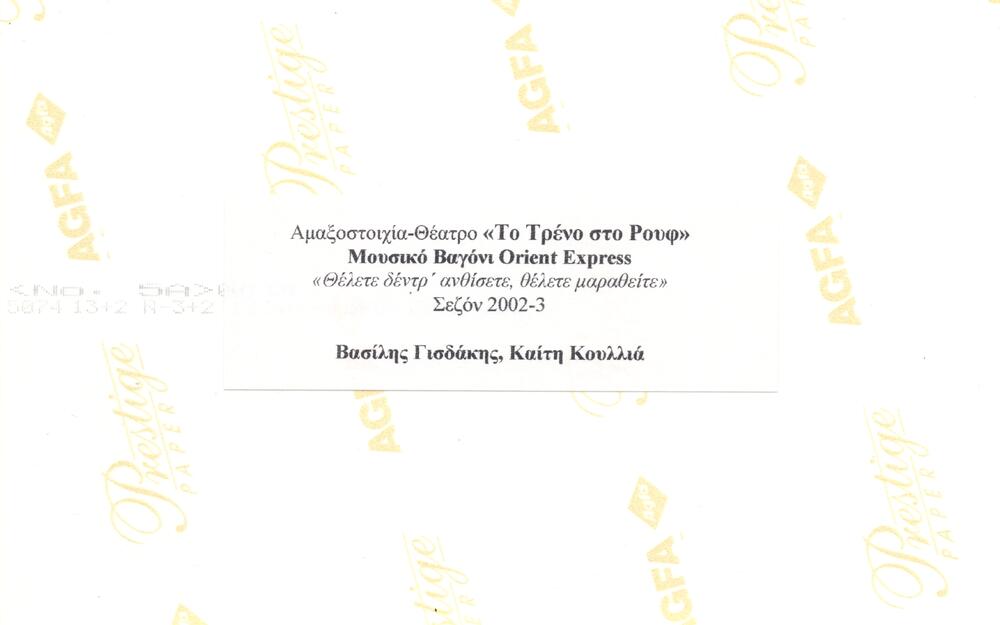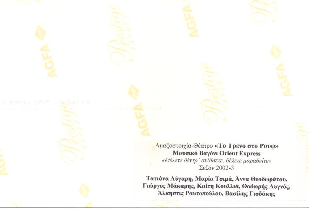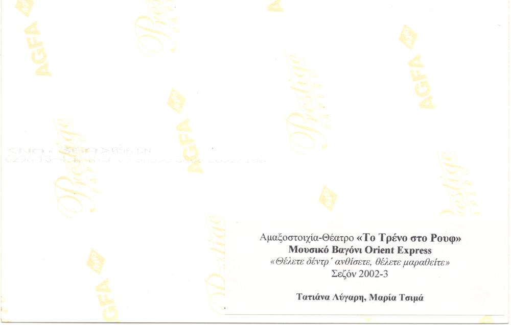 Φωτογραφικό υλικό του Χρήστου Λιάτση, με τους συντελεστές της δεύτερης σεζόν από την παράσταση με τίτλο «Θέλετε δέντρ’ ανθίσετε, θέλετε μαραθείτε», που ανέβηκε στην Αμαξοστοιχία – Θεάτρου το Τρένο στο Ρουφ και συγκεκριμένα στο μουσικό βαγόνι Orient Express για δύο σεζόν (2001 – 2002, 2002 - 2003) συνολικά. Στις φωτογραφίες εντοπίζεται και η σκηνοθέτρια της παράστασης, Τατιάνα Λύγαρη.
