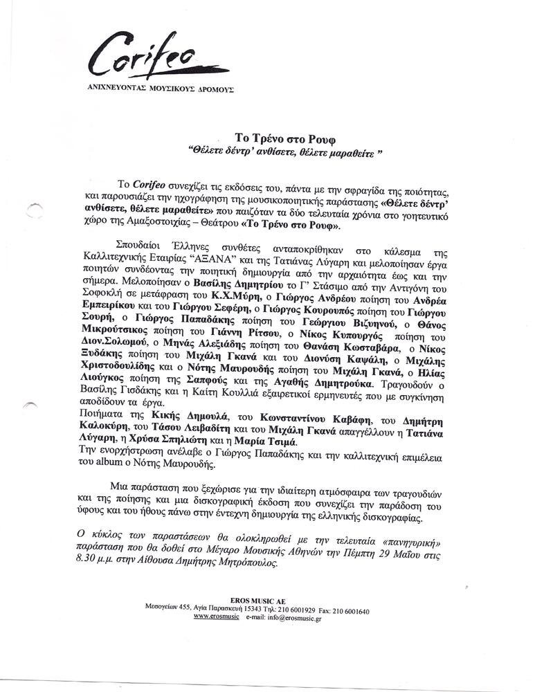Δελτίο Τύπου, Θέλετε δέντρ’ ανθίσετε, θέλετε μαραθείτε, Μέγαρο Μουσικής ΑθηνώνΔελτία ΤύπουΘέλετε δέντρ’ ανθίσετεΔελτίο ΤύπουΜέγαρο Μουσικής ΑθηνώνCDCorifeoEros Music AEΝότης Μαυρουδής